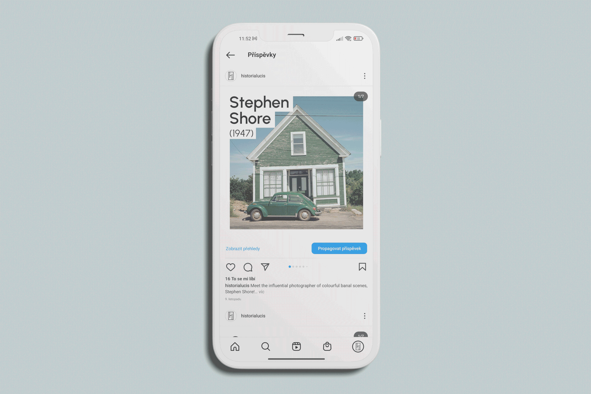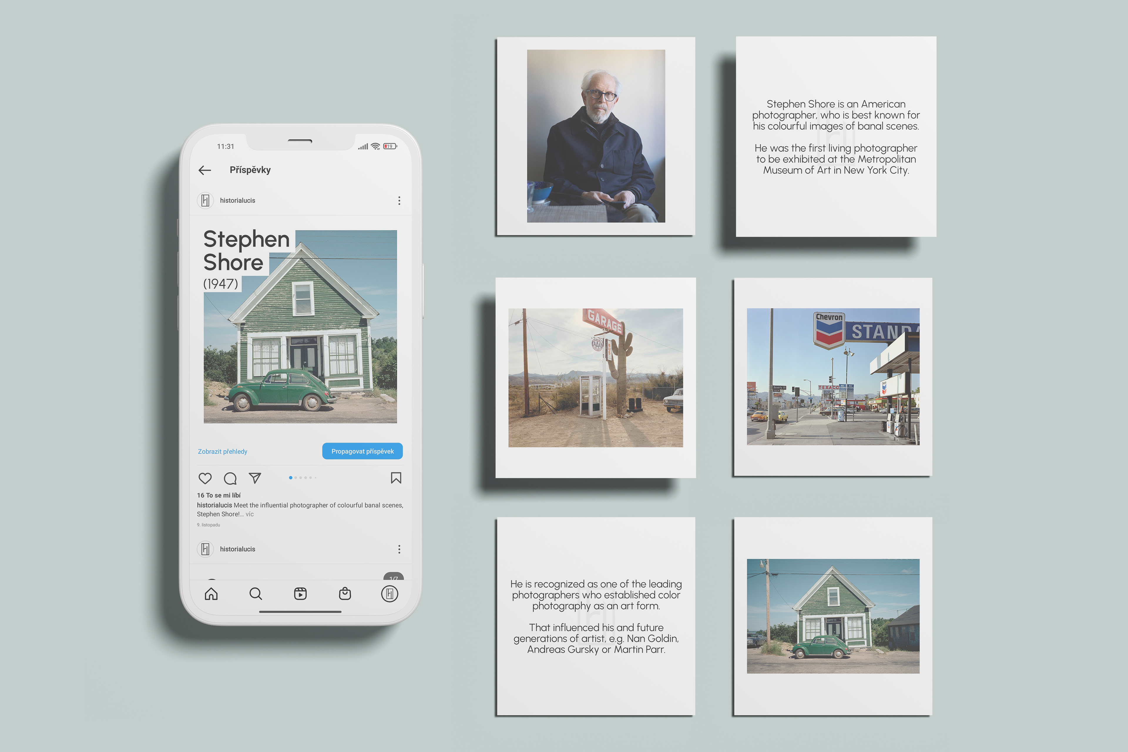 Besides logo the main task was to design the form of individual posts applicable for different topics and well-readable even on small displays. The introductory image's design refers to the old photographs with white frames. The same frames are then used for every image of the serie, but the dimensions of the original photograph is respected.